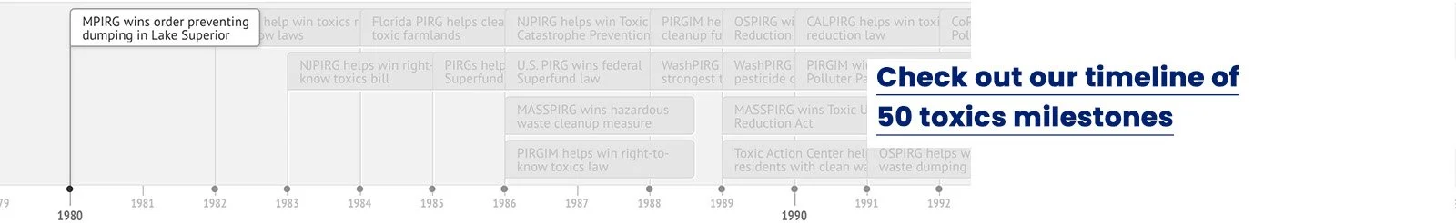 PIRG helped expose these dangers through investigative reports, public education and advocacy. While our initial work focused on the need for cleaning up the worst toxic spills and dumpsites, we increasingly adopted an approach rooted in the precautionary principle.